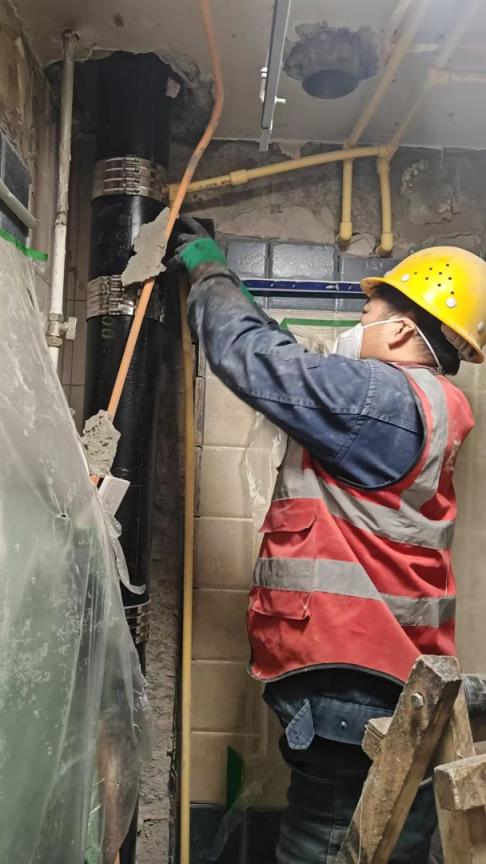 在砖角楼南里21号楼,施工东谈主员正在翻新高下水管谈。