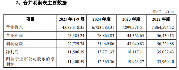 上市公司2022年、2023年、2024年和2025年1-9月的营收诀别为786.46亿元、789.96亿元、672.36亿元、408.93亿元;归母净利润诀别为3.40亿元、1.99亿元、1.26亿元、1.14亿元。主要财务数据如下: